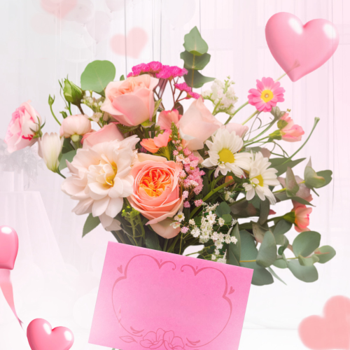 • Средний- роза - 5 шт., альстромерия - 7 шт., зелень, упаковка, лента
