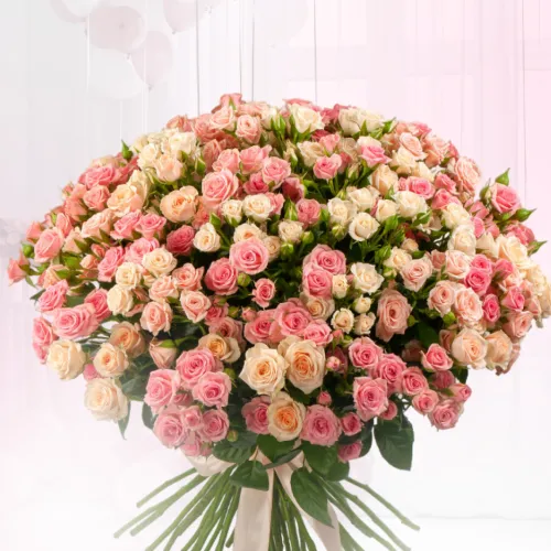 Роскошный букет из нежнейших белых и розовых кустовых роз подходит для подарка в День Рождения, Юбилей, 8 Марта, свидание, День Матери, 14 февраля.