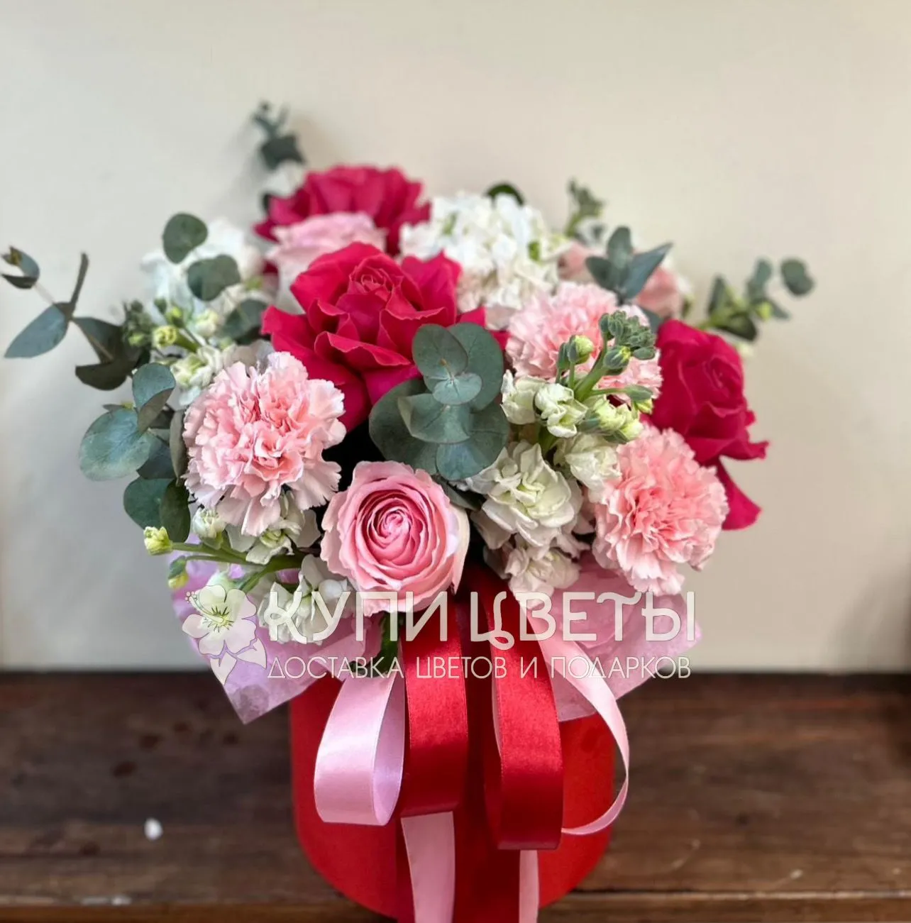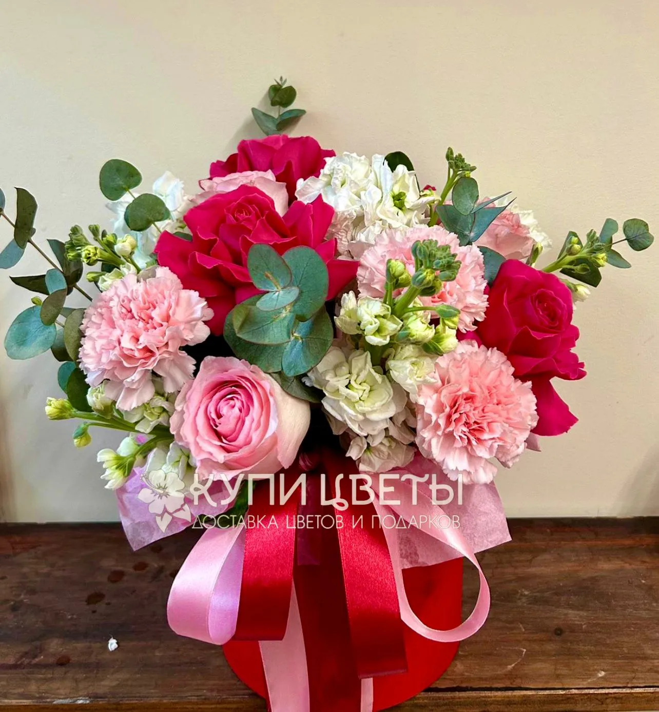 Французкая роза, роза, гвоздика, эвкалипт, шляпная коробка, лента