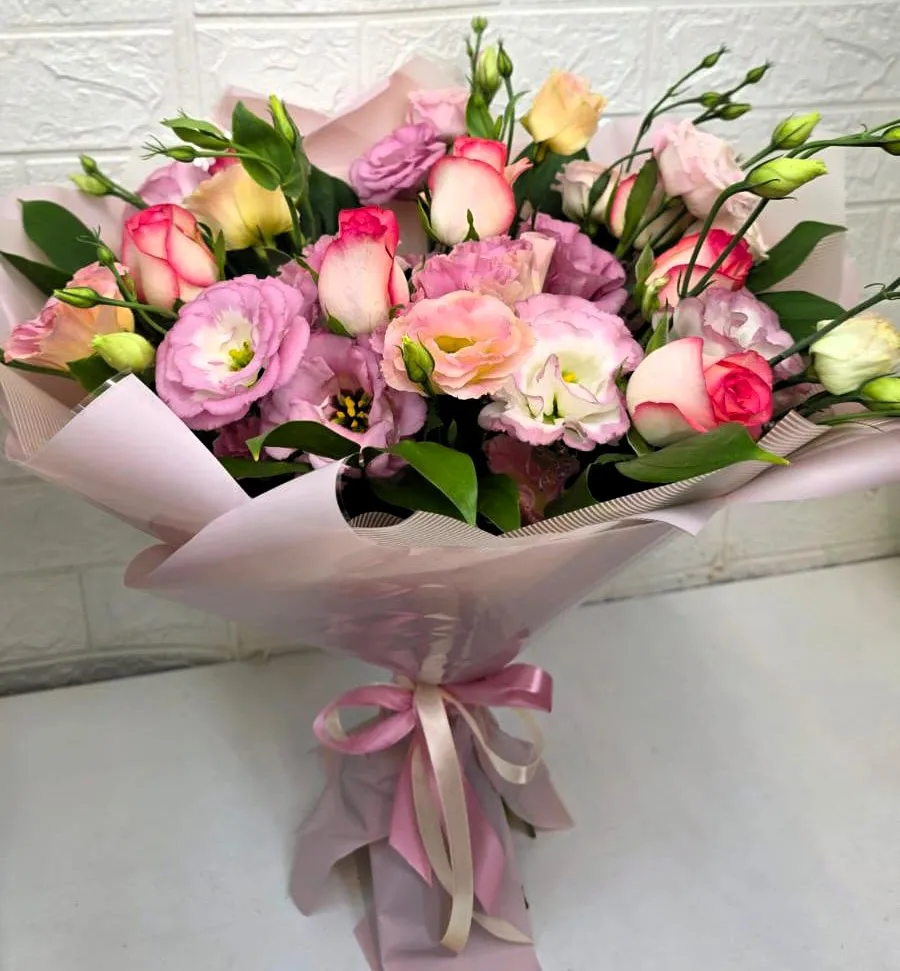 Сочетание роз и эустомы создает неповторимый визуальный эффект, где каждая деталь подчеркивает красоту другой. Розы привносят страсть и классику, а эустома – воздушность, нежность и современность. Этот стильный букет станет идеальным дополнением к любому событию, от официального мероприятия до личного праздника.