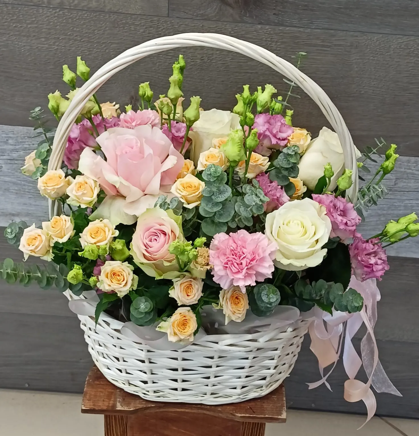 Эустома, с её тонкими, словно кружевными лепестками, украшают композицию, привнося мягкость и изящество. А эвкалипт, с его зелёными листочками и характерным ароматом, добавляет завершенность, придавая общей картине свежесть и природное очарование.