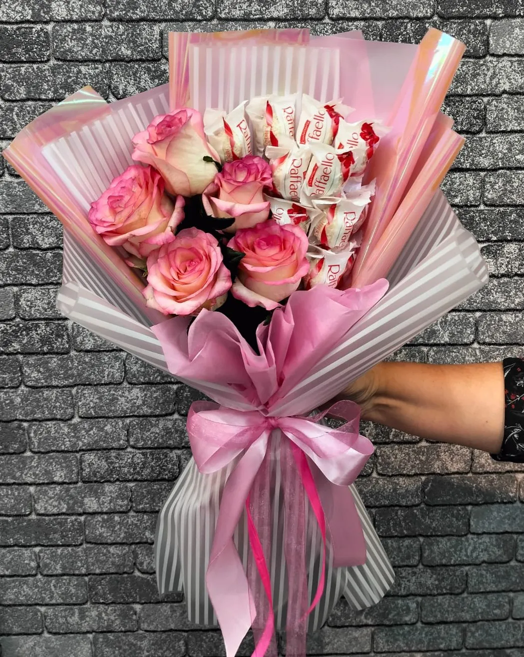 Такой букет станет идеальным подарком для любимой женщины, мамы или подруги, даря радость и поднимая настроение. Он прекрасно подходит для особых случаев, будь то день рождения, юбилей или просто выражение чувств. Нежность роз и сладость Рафаэлло создают идеальное сочетание, способное покорить сердце каждого!