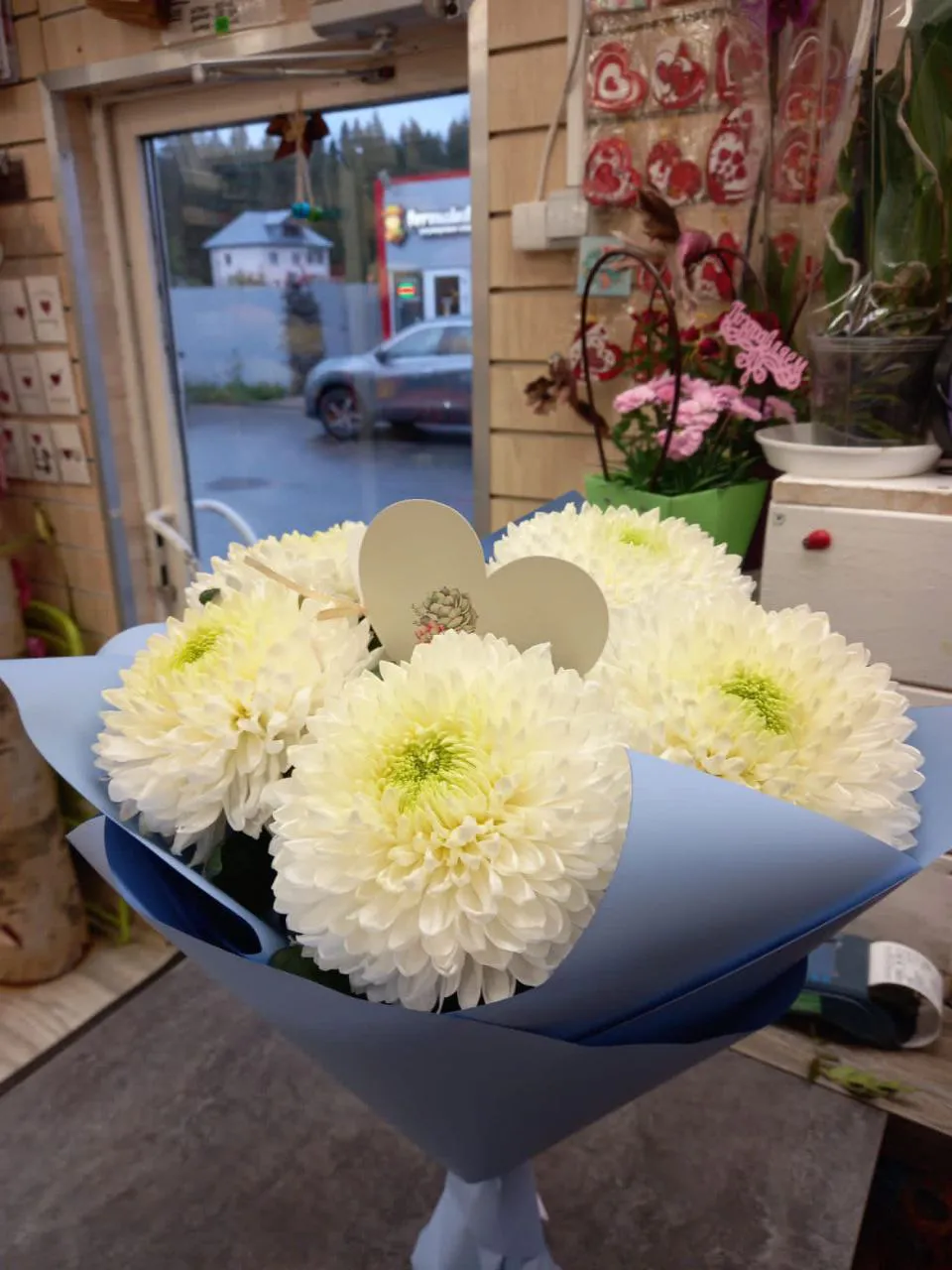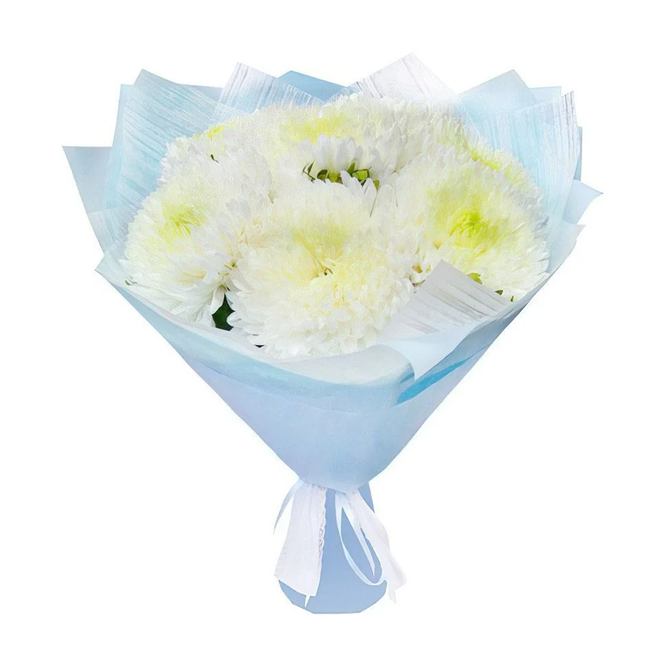 Букет белых хризантем в синей упаковке Пломбир