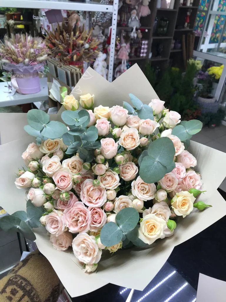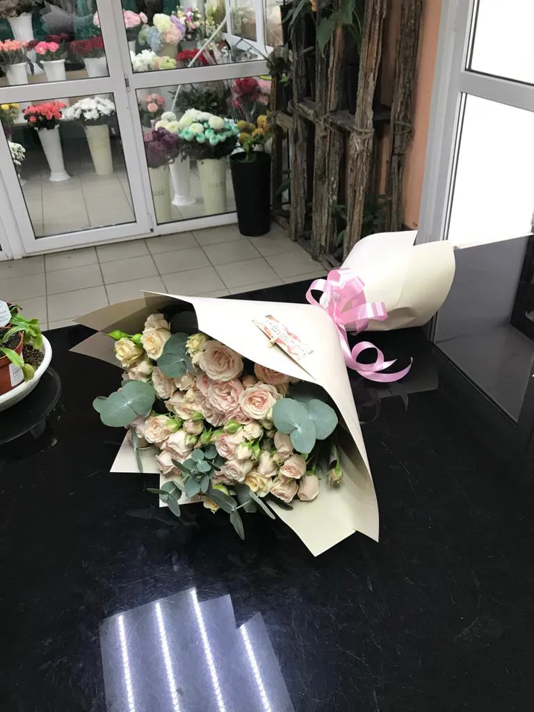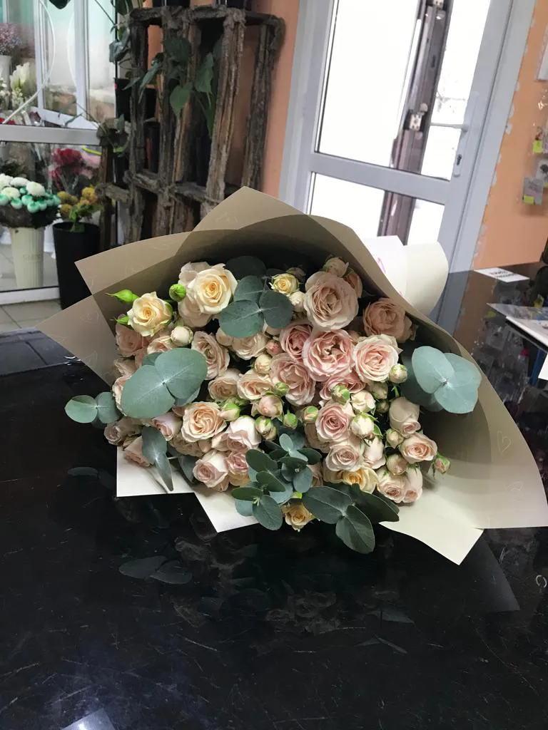 Состав букета : кустовые розы, зелень, упаковка,лента