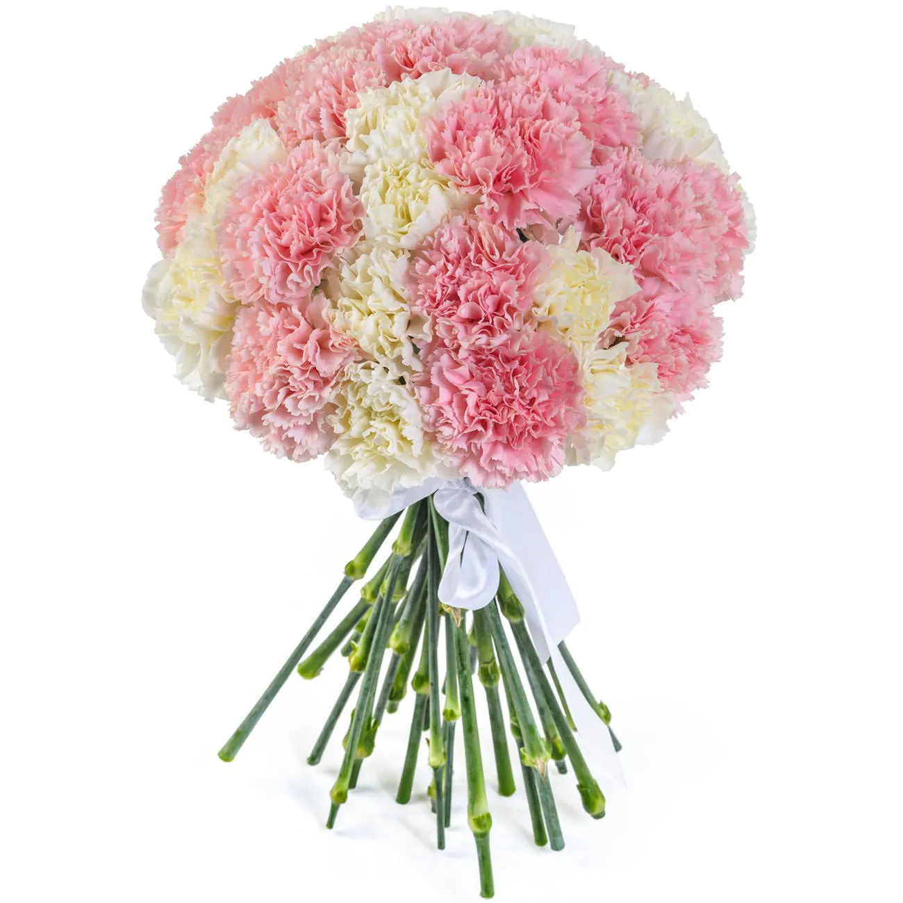 Состав букета: белые и нежно-розовые гвоздики, лента