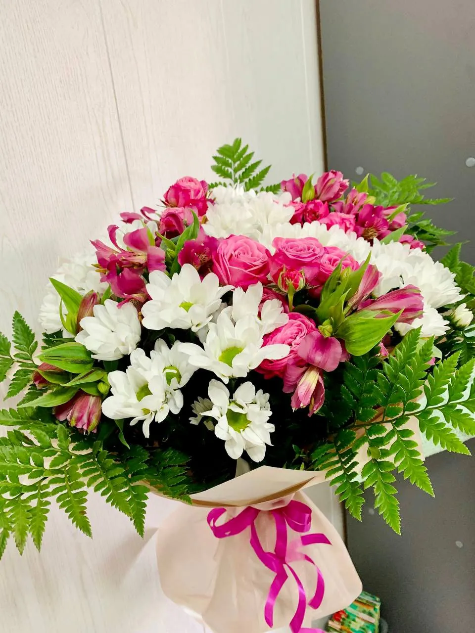 • Средний - кустовая роза - 5 шт., альстромерия - 4 шт., хризантема - 2 шт., зелень, упаковка, лента