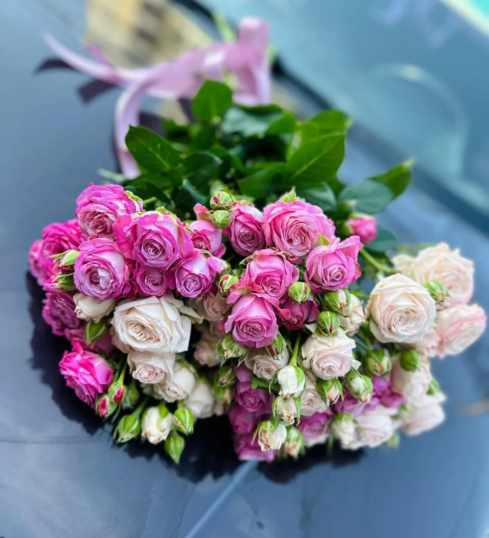 Этот букет из ярко розовых и нежно розовых кустовых роз — настоящая симфония цветов, которая восхищает и радует глаз. Яркие, насыщенные оттенки первых партий роз сочетаются с мягкими, пастельными тонами вторых, создавая удивительный контраст и гармонию.