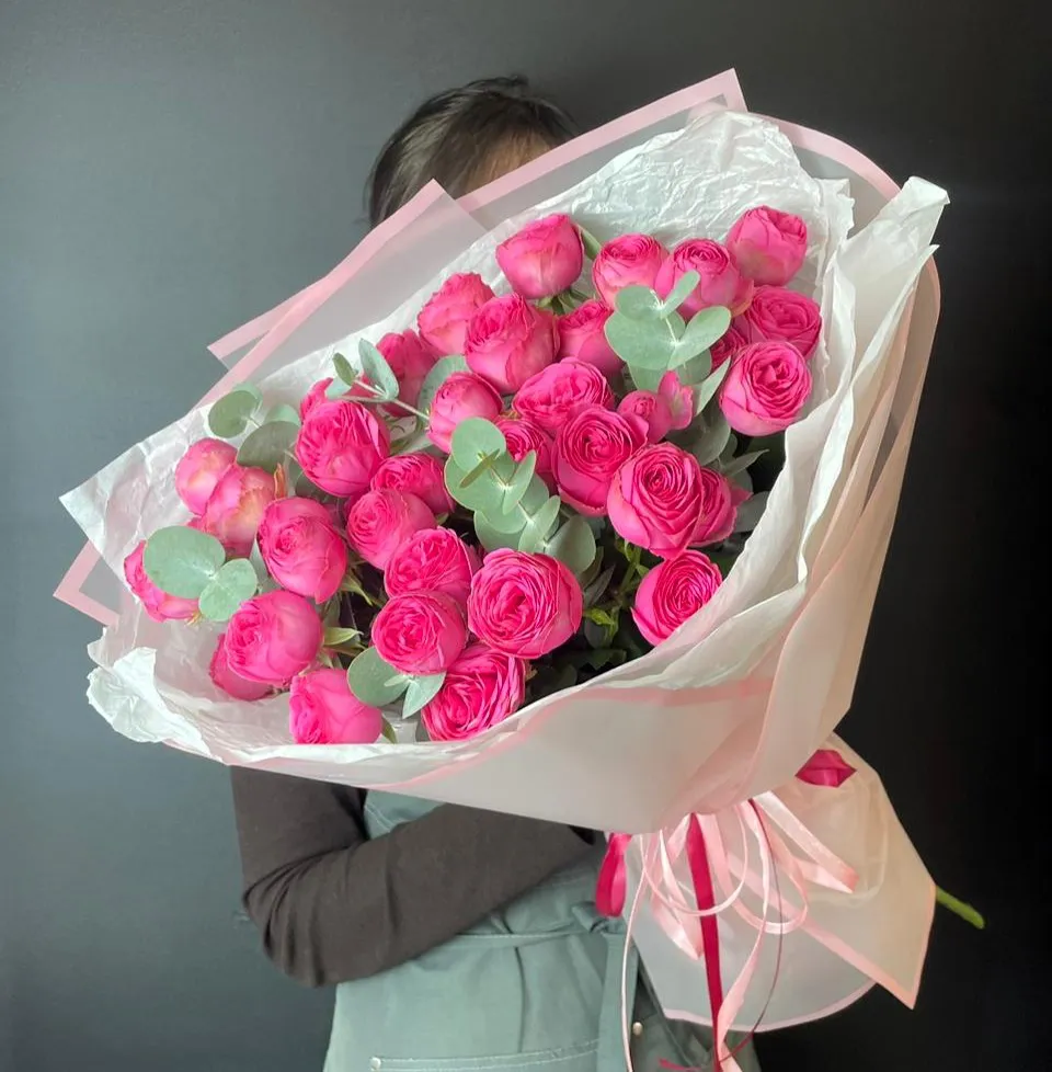• Средний - кустовая роза - 7 шт., зелень, упаковка, лента