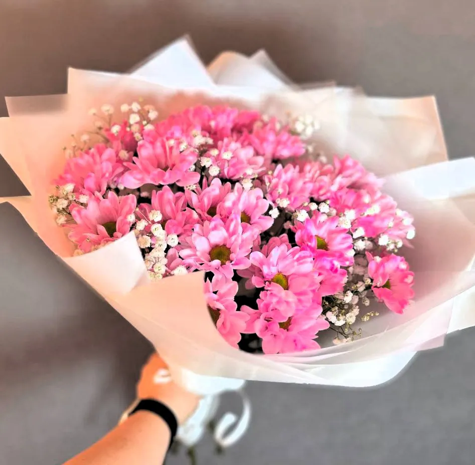 Каждый цветок в этом букете словно воплощает весеннее пробуждение природы. Розовые хризантемы имеют деликатный аромат и насыщенный цвет, который добавляет яркости и радости в повседневную жизнь. Гипсофила, с её мелкими белыми цветочками, придает композиции лёгкость и романтичность, идеально дополняя основное богатство букета.