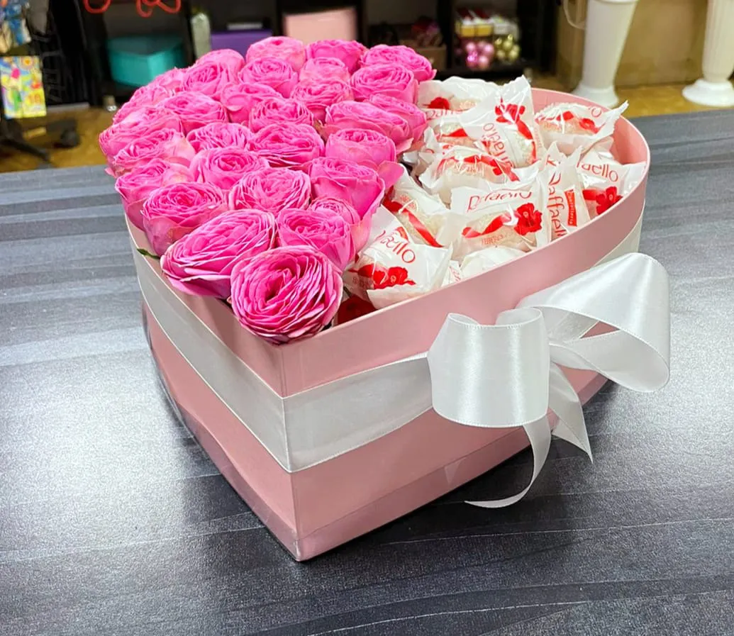 Розовые розы в коробке сердечком и всеми любимые Рафаэлло. Самая романтичная композиция .