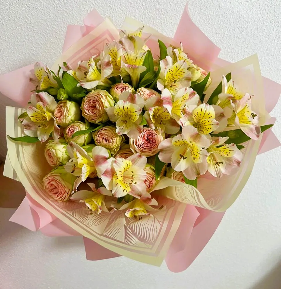 Кустовые розы, альстромерии, упаковка, лента