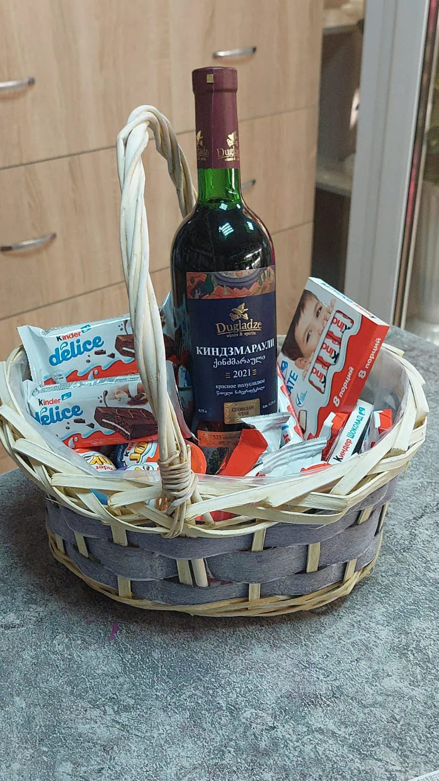 Состав: Kinder Сюрприз - 5 шт., Kinder шоколад (100 гр.), Kinder Bueno - 3 шт., Kinder Country - 3 шт., конфеты Kinder 125 гр., корзина