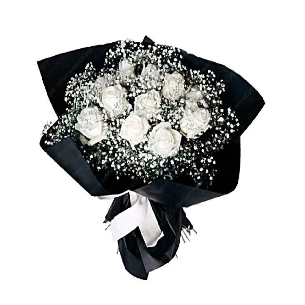 —Траурный букет № 4 из 9 белых роз и гипсофилы