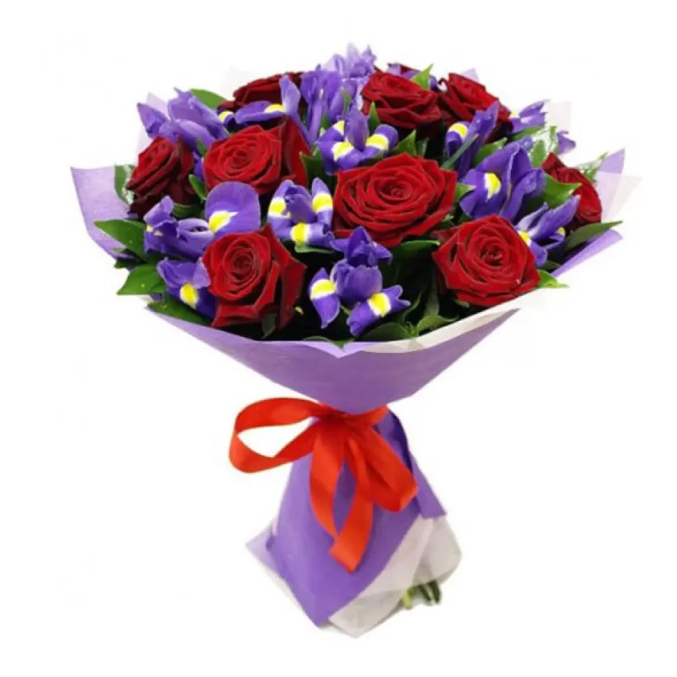 • Средний - роза - 7 шт., ирис - 12 шт., зелень, упаковка, лента